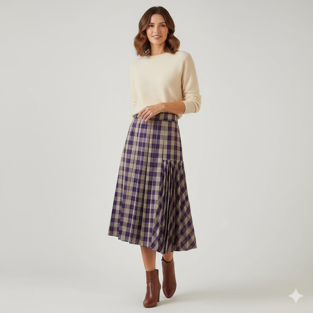 Crafted from a luxurious fabric featuring a captivating purple and cream plaid pattern, this skirt is designed to turn heads. The unique asymmetrical hemline and delicate pleating on one side add a modern, dynamic touch to a classic design, ensuring you stand out from the crowd. Its midi length offers a sophisticated silhouette that’s perfect for both office chic and weekend adventures.