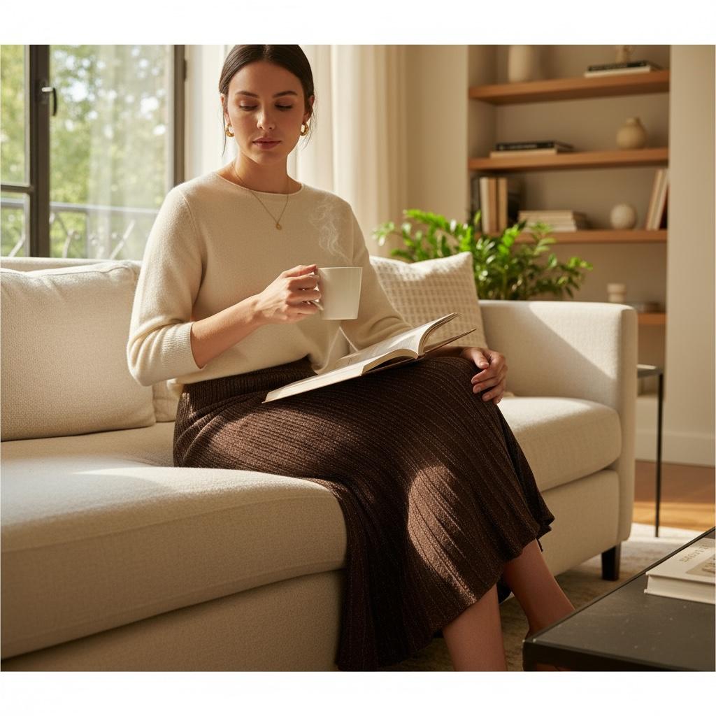 Whether you’re enjoying a cozy morning with a book or stepping out for an evening under the city lights, the Glimmering Rib-Knit Fluted Midi Skirt promises comfort, sophistication, and an irresistible sparkle. Prepare to captivate and charm!