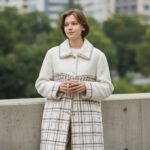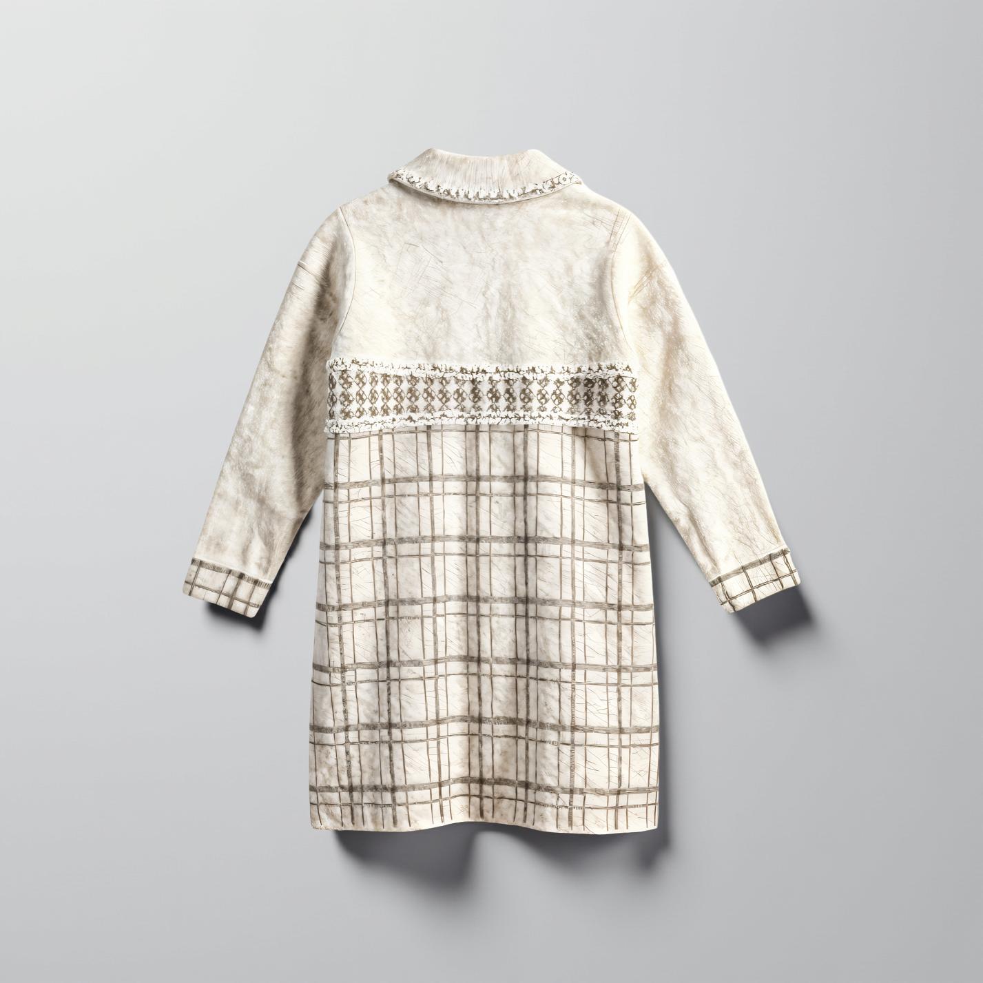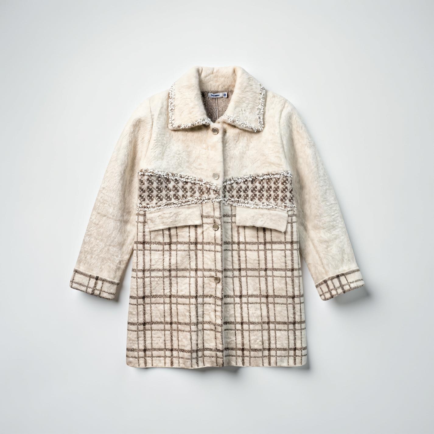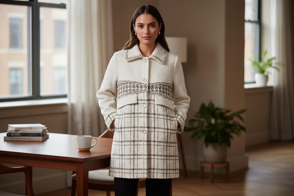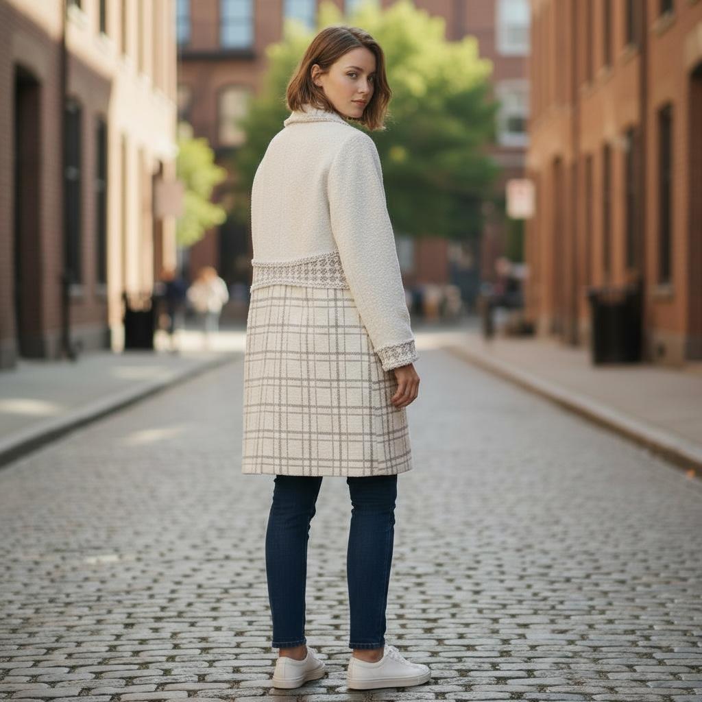 - Luxurious Mixed Textures: This coat is a masterpiece of tactile design, featuring a harmonious blend of creamy bouclé or brushed wool fabric on the upper body and sleeves, contrasted with a refined plaid pattern on the lower half. The plaid itself appears to have a beautiful, subtle texture.