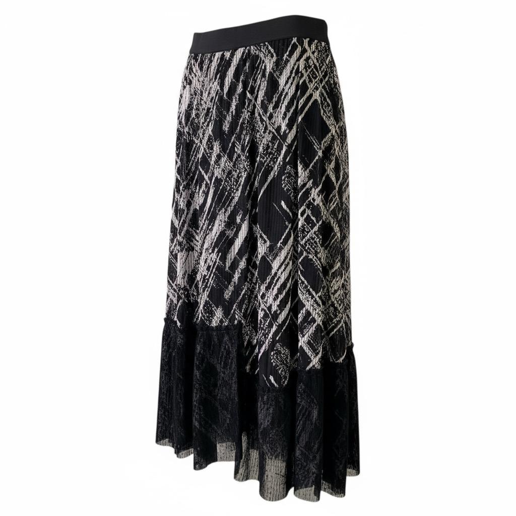 Make an unforgettable statement with our Monochrome Majesty Midi Skirt, a true piece of wearable art! This isn’t just fabric; it’s a captivating cascade of striking black and white graphics, designed to turn heads whether you’re strolling through a gallery or walking into the boardroom. The dynamic, abstract pattern is balanced by a sophisticated midi length and finished with a dreamy, sheer tulle ruffle that adds movement and irresistible flair.