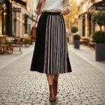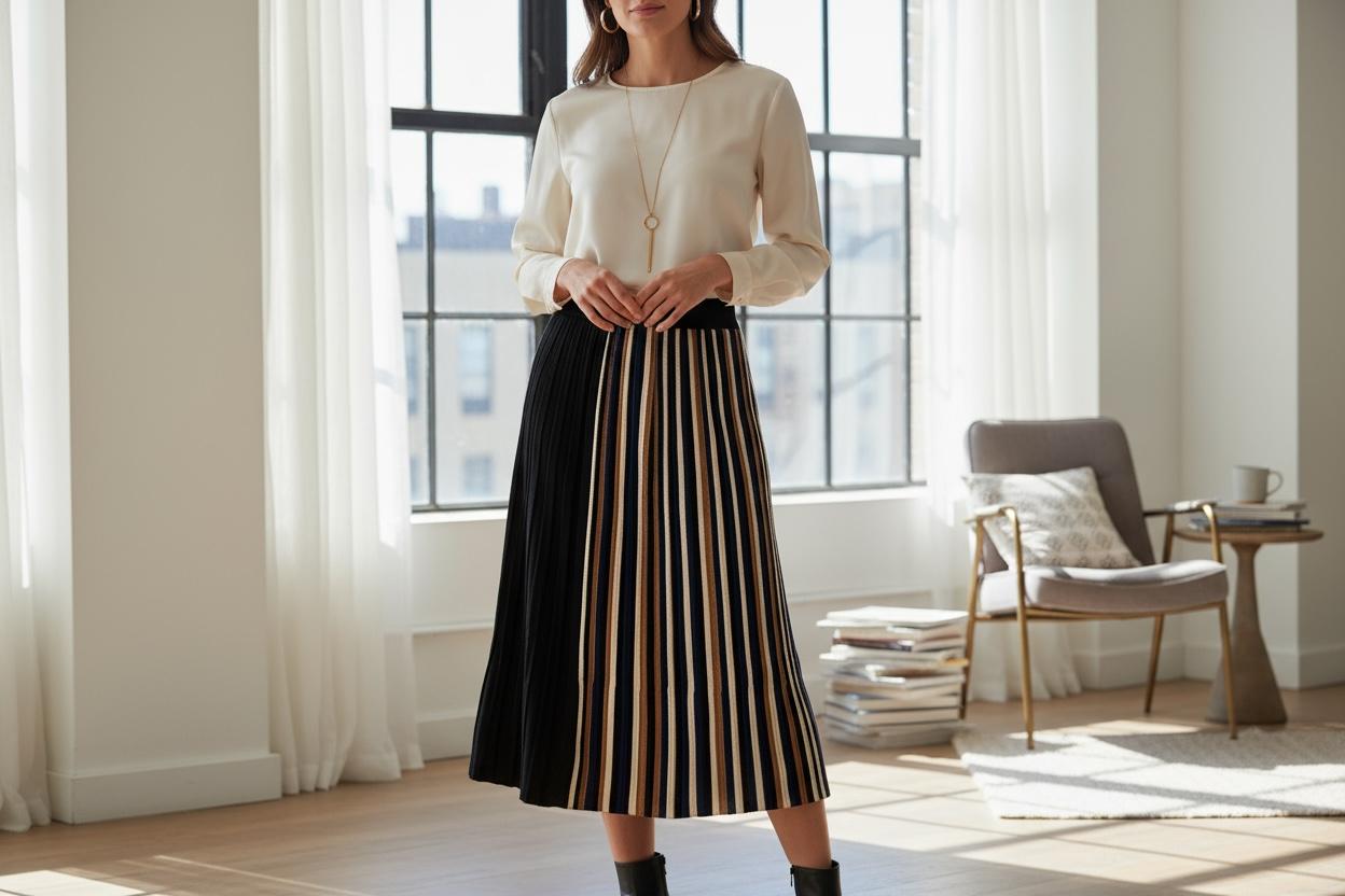 • Bold Asymmetry: The design features a dramatic, eye-catching contrast: one side showcases a classic, solid black pleated panel while the other boasts a mesmerizing multi-colored vertical stripe panel. The stripes—in shades of cream, caramel, deep navy, and terracotta—are perfectly placed to create a slimming, lengthening visual effect.