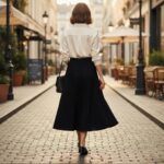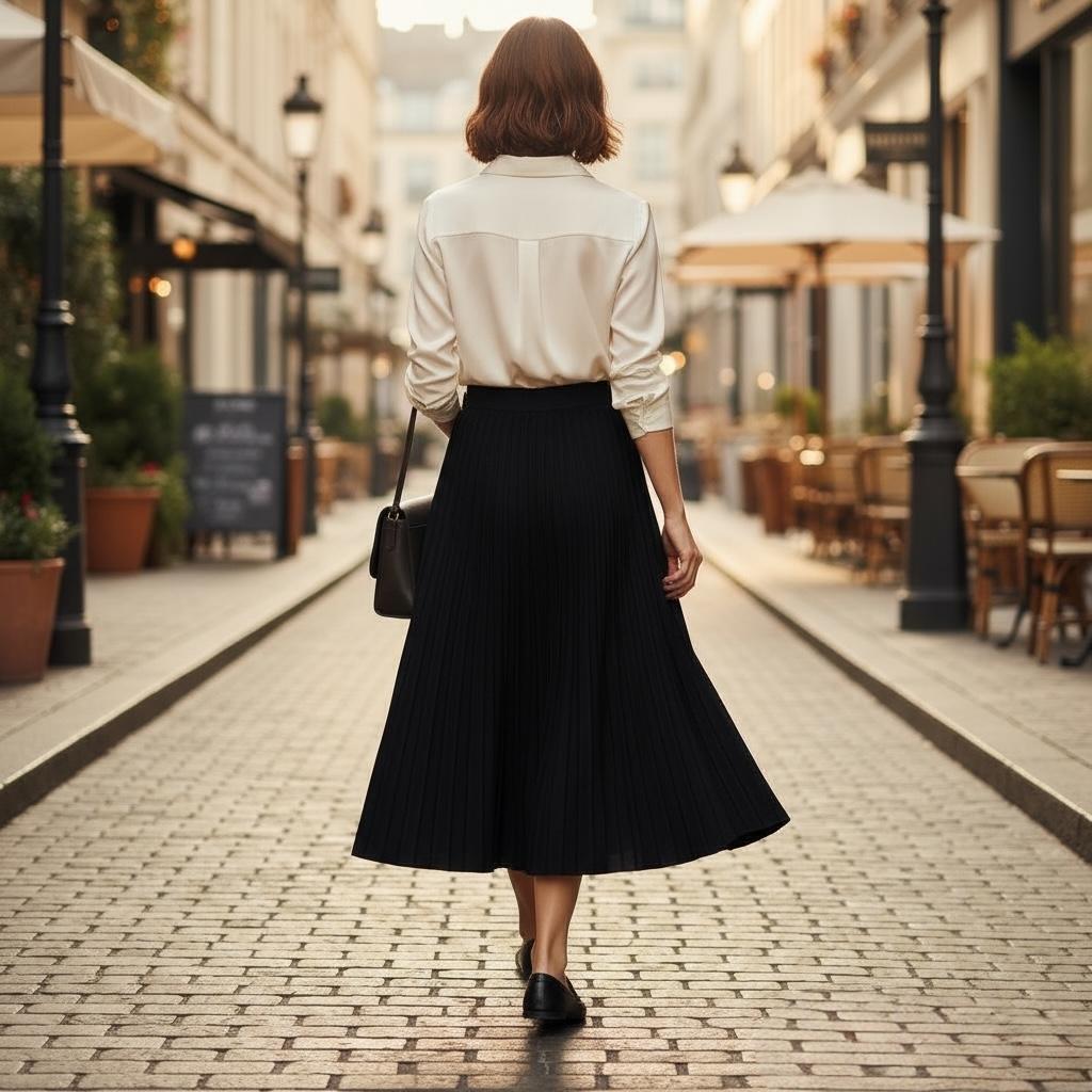 2. Modern Power Dressing: For the office or a formal meeting, pair the skirt with a fitted black fine-gauge turtleneck and knee-high black suede boots. Layer with a streamlined black blazer to enhance the sophisticated color-block effect, creating an outfit that commands attention.