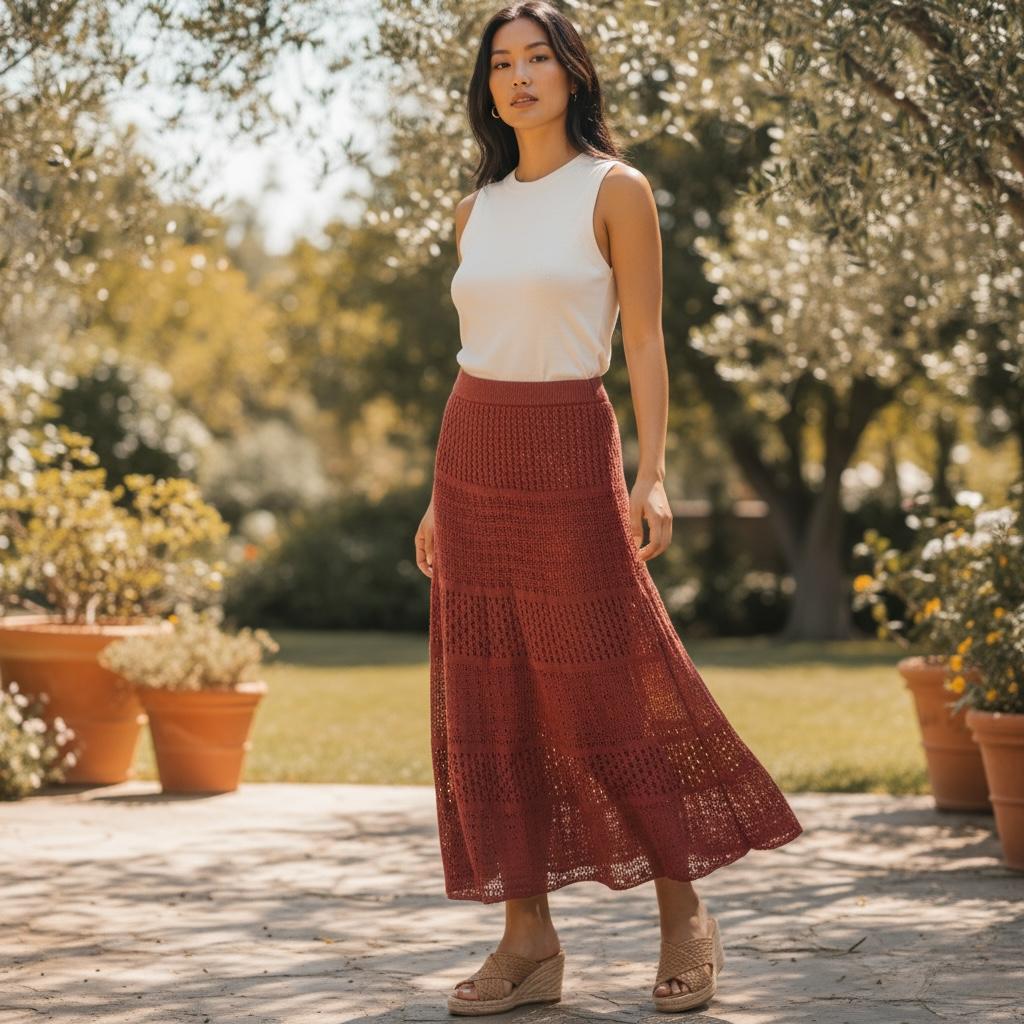Unleash your inner free spirit with our breathtaking Bohemian Rhapsody Open-Knit Midi Skirt! This is more than just a skirt; it’s a whisper of warm breezes, sun-drenched days, and effortless elegance. Imagine the delicate caress of its intricate knit as it sways with every step, creating a captivating silhouette that celebrates movement and grace. Drenched in a rich, inviting terracotta or deep rust hue, this skirt evokes the romance of faraway lands and artisanal charm, making it a truly unique addition to your wardrobe.
