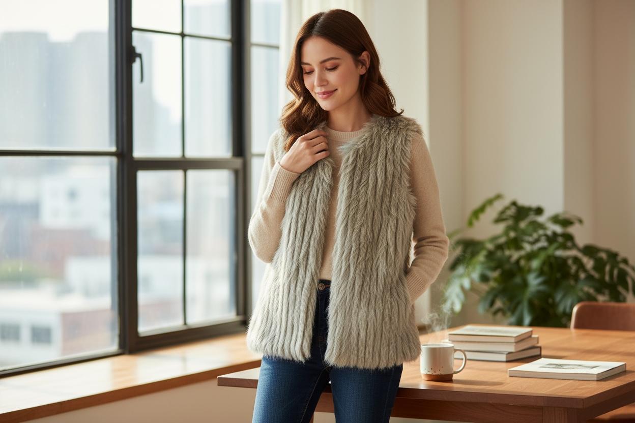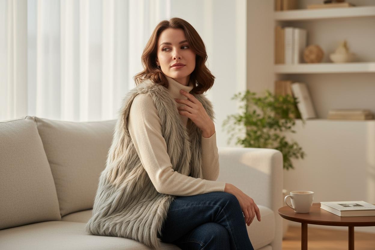 Whether you’re enjoying a quiet moment by the window, catching up with friends, or stepping out for a touch of glamour, the Whisper Soft Faux Fur Vest promises to wrap you in comfort and turn heads with its undeniable style.